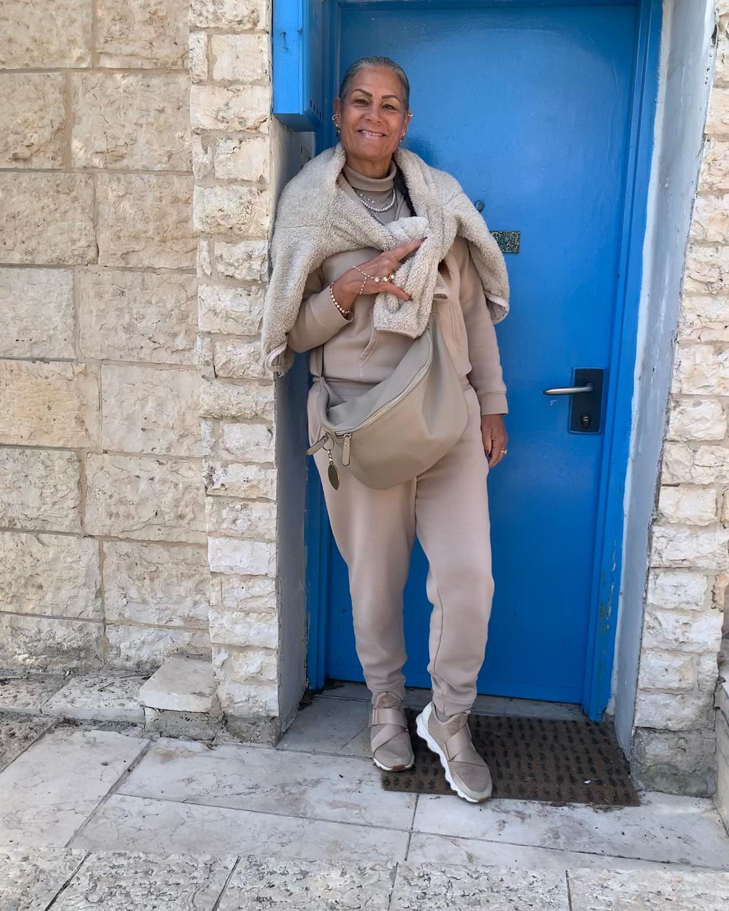 This is a sweatsuit from Fox that Einat has elevated to new heights by adding a monochromatic turtleneck, beige fuzzy jacket, melange socks, cute running shoes, a bag from a trip to Greece, and layers of intricate jewelry. It's all so perfect.